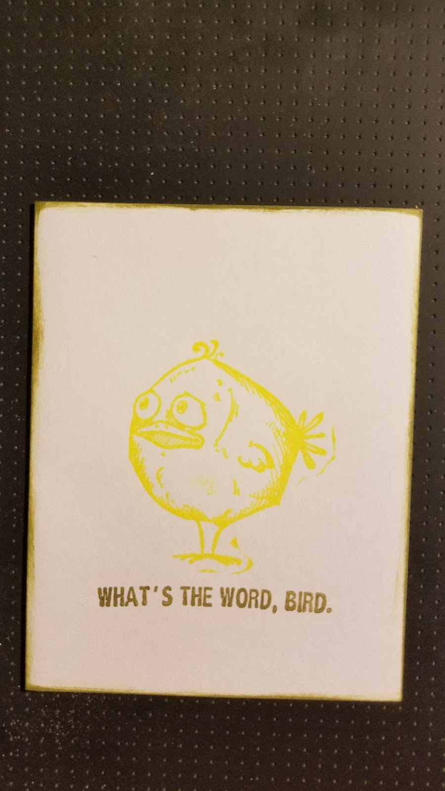 Tim Holtz bird image in yellow ink on white cardstock. I used a light brown around edge and the the sentiment.