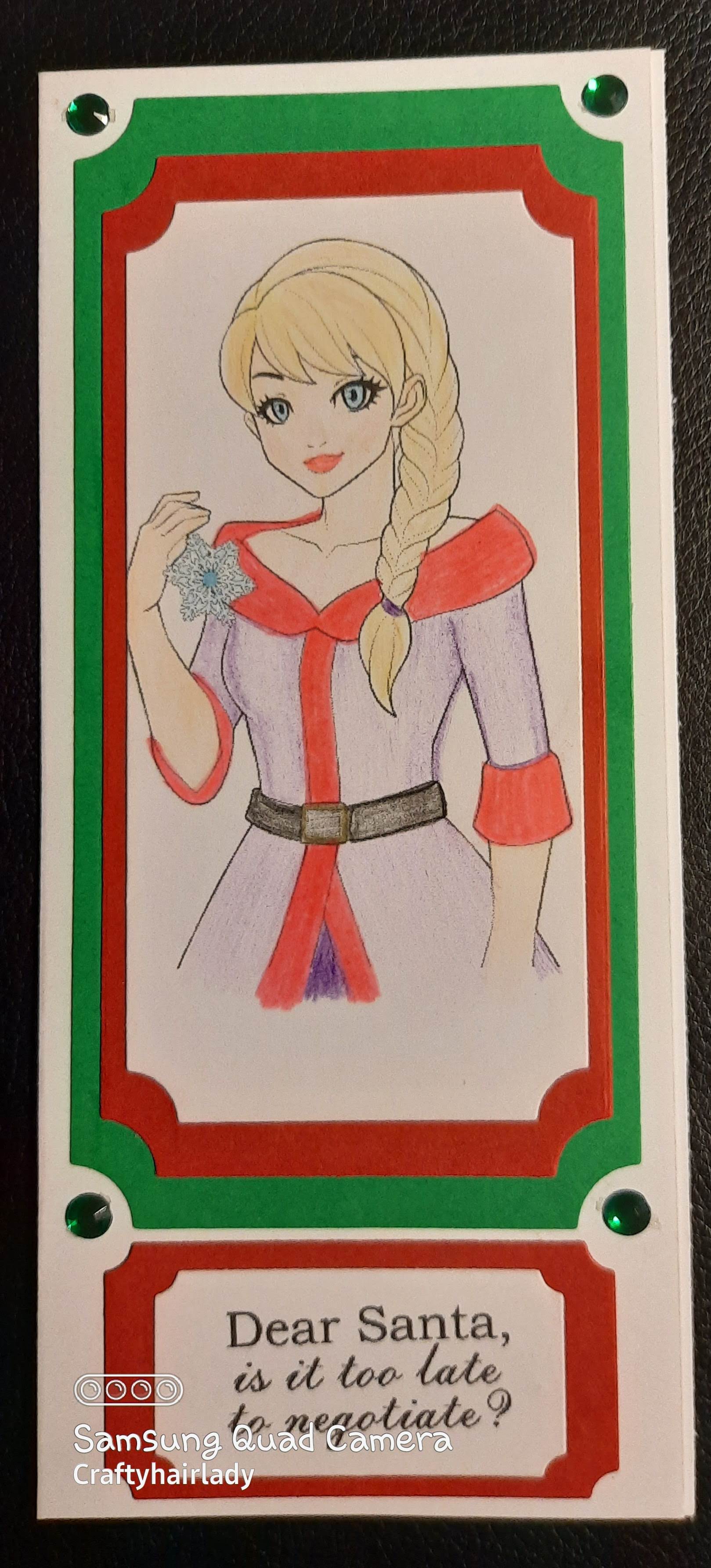 Image is by Sweet Escape, colored in pencils. Made a slimline card in Christmas colors. Used slimline dies for each layer. Added green dots.
