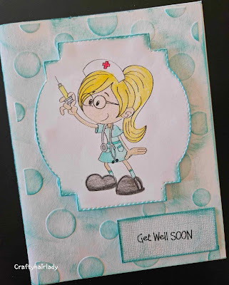 The image is by Dr digi,colored with pencils, layered on an embossed circle pattern. I used teal ink over the embossed area and around the fancy stitched diecut l I popped the sentiment up with foam.
